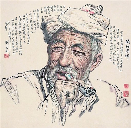 刘文西的艺术,不仅靠形式、语言、技巧取胜,还有那些具有独特性、生动性、真实性的形象。他的心连着陕北人民,他的情系着黄土高坡,足迹遍布陕北的乡乡镇镇,画了几千个农民肖像和上万张速写。基于此,他的一腔真情实感,才能呼之欲出,跃然纸上,因而能载道而精神出、境界生,升华成艺。