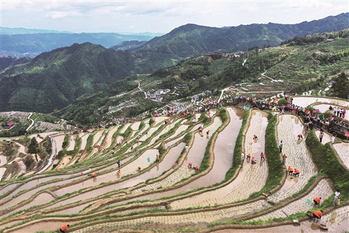 5月27日,溆浦县葛竹坪镇山背花瑶梯田景区,村民和游客进行插秧比赛。初夏时节,该景区举行插秧节活动,让游客体验花瑶稻作文化。曾勇 摄