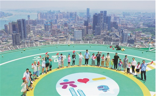 5月28日,长沙国际金融中心楼顶停机坪,中建二局国金中心的建设者代表与他们的孩子一起完成巨幅“六一”主题图画,共同迎接儿童节到来。湖南日报全媒体记者 徐行 通讯员 邹园 摄影报道