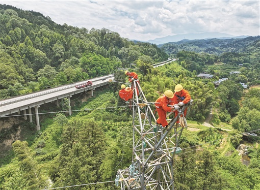 5月29日,洪江市安江镇秀建村,施工人员在改造跨越沪昆高速的35千伏安罗线。为保障公共安全,今年,国网怀化供电公司将对50条不满足安全要求的跨铁路、跨高速公路、跨重要输电通道的“三跨”电力线路开展集中改造,消除隐患。