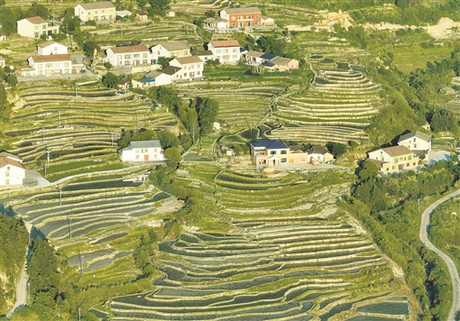 5月28日,平江县福寿山镇芦溪村,依山势而筑的梯田层层叠叠,如带似线,绘成一幅自然和谐的田园美景图。