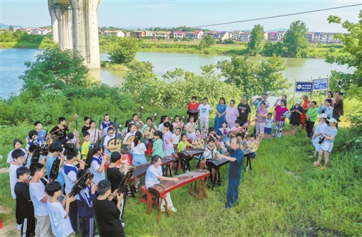 醴陵市东富镇枧头洲,青青的渌水河畔,可以听见花开的声音。一位老人带着一群中小学生,和着节拍,行走在田野上……