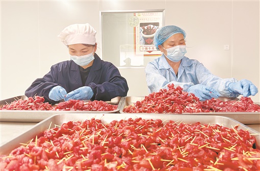 在离牛席一条街车程不到10分钟的食品加工厂,一块块牛肉经切割、制作、包装等工序,变身成罐装牙签牛肉、牛肉酱、牛板筋等即食产品。“去年5月,我们借‘牛全席’的名气,发展牛肉精深加工产业,打造‘可以提着走的牛席’伴手礼,让牛席特色小吃走向全国。”加工厂负责人李家玉介绍,伴手礼主要有8种牛席特色小吃,采取订单制销售,线下已与23家餐饮门店、学校、机关单位签订采购合作协议,上个月营收20万元。