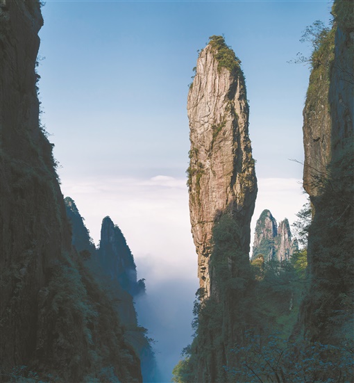 在五指峰景区,一条栈道,悬挂在数百米高、笔陡的绝壁上。身下,是万丈深渊。栈道对面,耸立着一座一座造型奇特的山峰。其中有一座,如人伸出的五个指头,指向天幕。故称五指峰。同行的朋友老蔡,恐高,在悬挂于绝壁的栈道上行走,不敢往下看,身子紧靠着岩壁,小心翼翼地攀着石岩,缓缓地朝前挪动脚步。为了一睹前面的美景,他没有后退,硬是走到观景台,美美地观赏了对面的几座奇峰怪岭后才返回。