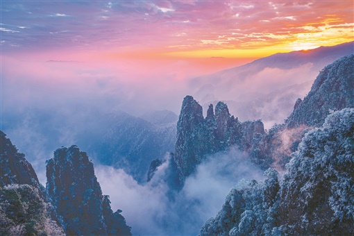 终于登上五指峰极顶,短暂惊悚后,眼前一望空阔:近处,湖南境内千峰林立,花岗岩体的瘦峭峰峦如刀削斧砍,岩壁或峰巅的罅隙中挺出高低不一的松树,于是,险峰、奇松与怪石又勾勒出一幅幅绝美画图;远处,广东境内峰峦低矮许多,却也层层叠叠,仿佛咆哮翻腾的海浪,晚霞中,“苍山如海,残阳如血”。
