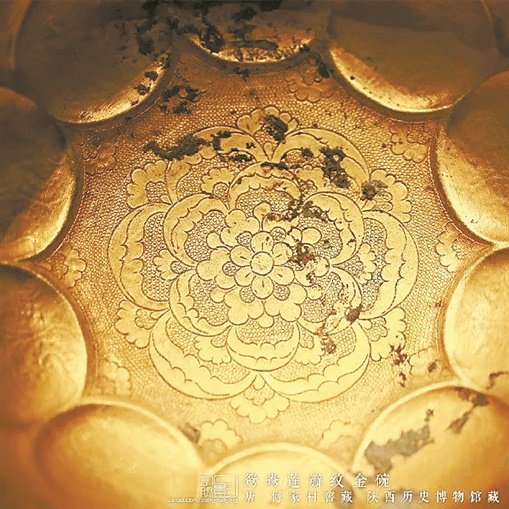 他让我们聚焦一盏鸳鸯莲瓣纹金碗的碗底,看一片片莲瓣浮动着,透出柔和与温暖。照片中心,便是莲瓣中心,莲瓣簇拥着的竟是一朵忍冬花。柔婉轻盈的花朵上,虽然已留下岁月的斑驳痕迹,但依旧记录着唐代工匠的细细錾刻。又想起,忍冬花生生不息、无穷无尽的寓意。碗底的这朵花似乎开始呼吸,在静默里吐露着光辉。