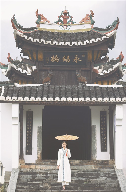 情弥古道循茶马,梦伴伊人上鹊桥。风雨桥也是连接亲情的纽带。赵亚飞小时候,外婆和父母经常要他在永锡桥上接送在外工作的亲人。他与小伙伴唱着歌谣“姨娘姨娘你莫哭,我接你到屋;姨娘姨娘你莫笑,我送你过桥”,在桥上来回奔跑,见证了一次次亲人的送别与重逢。风雨桥跨越河流两岸,人们跨越岁月春秋。