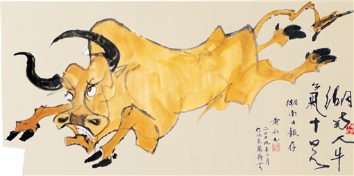 “黄永玉九十画展”上,一幅泼墨彩荷的跋特别有诗意:“我知道梦的尽头是醒,如果梦可以切成碎块,将撒出满天繁星,你可曾在梦中做梦?醒来如华羽般轻盈,细心在涧边洗我的梦,以便醒来亭亭。”笔墨抽象,荷叶氤氲,如烟似雾,衬托着几朵尖锐响亮的白荷,那荷花虽简笔勾勒,却变化莫测,透着诡异,那一定是梦与现实的辩证和对立。他的作品里,有他的通达和明亮,以及通过艺术表达出来的生活哲学和处世之道,观者若看出了其中的妙处,就会突然有一种感觉:打开窗子,满园姹紫嫣红,一坡的荼蘼!他的智慧、顽劣、戏谑,一般人又学不来,那是他一辈子积攒下来的好东西,它只姓黄。