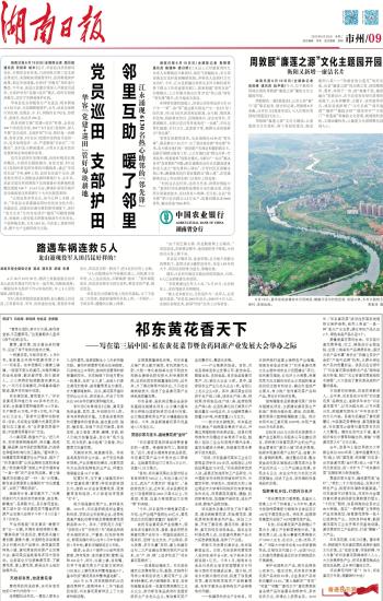 一根黄花菜,半部祁东史。6月中旬,笔者慕名来到中国黄花菜之乡——祁东县。在中国黄花小镇黄土铺镇,一眼望不到头的黄花,如随风舞动的金色涟漪,散发着芬香,吸引着游人。三三两两的姑娘散落在黄花丛中,一双巧手采摘黄花,吟唱着幸福的歌谣,歌声在花海中回荡。
