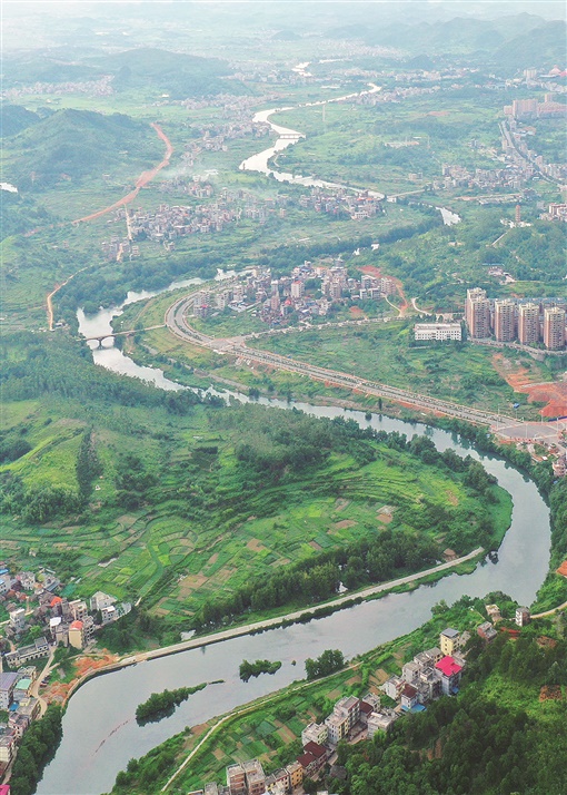 6月19日,嘉禾县珠泉镇钟水河茂林段,蜿蜒河流与村居民房、田园山林、乡村公路相互映衬,美丽如画。黄春涛 摄
