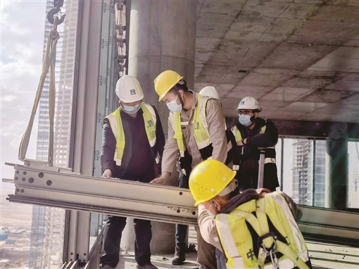 记者在现场遇到湖南企业——中建不二幕墙装饰有限公司员工杨云佚,他抹着汗,正在查看幕墙安装进度。