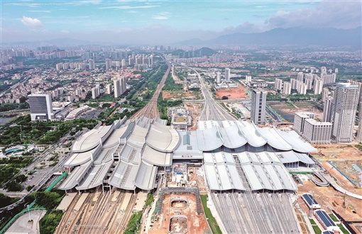 新建厦门北站是国内首条跨海高铁——福厦高铁全线施工难度最大的车站,站房建筑面积25万平方米,位于既有厦门北站北侧。新建厦门北站屋面采用东西向、南北向双曲结构,南北向弯弧半径达56米,屋面最高点与最低点相差24米,是目前全国铁路站房公共空间吊顶弧度最长,高差最大高铁车站。新建厦门北站建成后,厦门北站总体规模将达到13台27线,年旅客发送量达5000万人次,将为打造福州、厦门“一小时经济圈”和厦漳泉“半小时交通圈”提供强劲动力。图为6月19日拍摄的福厦高铁新建厦门北站(无人机照片)。新华社 发