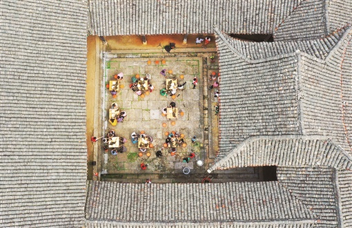 上图 6月21日,新田县金盆镇李仟二村,村民在古村祠堂包粽子。当天,该村开展包粽子比赛,村民围坐一起话习俗、包粽子,喜迎端午。