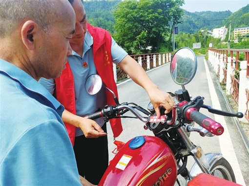 近日,绥宁县河口苗族乡组织道路交通安全管理“两站两员”深入田间地头,将自制的“请戴好头盔”的温馨提示语贴到每一辆摩托车、电动车上最显眼的地方,时刻提醒驾乘人员佩戴好安全头盔。