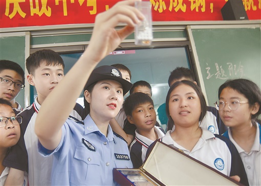 6月25日,嘉禾县钟水九年制学校,民警向学生展示仿制毒品模型,介绍辨别方法。当天,该县开展“禁毒宣传进校园”活动,提高学生识毒、防毒、拒毒能力。