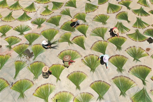 6月27日,祁东县金桥镇金龙村,农民在晾晒席草。作为当地传统产业,该镇1600亩席草眼下迎来收割季,农户抢抓天气忙着收割、晾晒席草。陈延上 摄