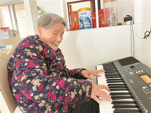 每天上午,安乡县深柳镇西门口社区97岁老人吴思云,都坚持练习弹琴,格外投入。