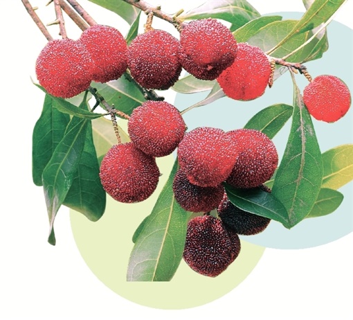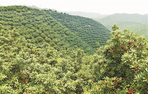 灌木丛生的半山腰,生长着几棵稀稀拉拉的野生杨梅树。红彤彤的杨梅挂在枝头,夹杂在植被丰茂的绿树丛林,宛若红霞流韵,随风起伏,梅香浮动。
