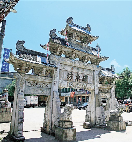 距县城不远,在益道三拱门范家村,我见到了一座造型独具的牌坊。四柱三门,三层檐帽,整座石坊上下协调,沉稳秀丽,运用阴刻、浮雕、圆雕、镂雕等各种手法,玲珑剔透,精巧生动。无论从哪个角度看,都是一件精美无比的石坊艺术杰作。它有一个美丽动听而又严肃庄重的名字,叫“绣衣坊”,“绣衣”“绣衣吏”是古代对监察官的别称,绣衣坊是古代专门旌表监察御史的牌坊。据专家介绍,汝城绣衣坊是全国目前唯一一座保存完好的监察御史牌坊,2013年被列为全国重点文物保护单位。