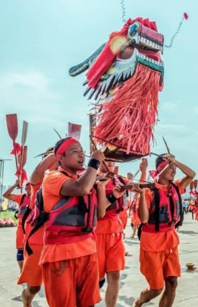 心心念念的龙船做好后,必须要举行庄严盛大的下水仪式,俗称“关头”。关头时,所有划手手执桡片,按顺序伫立在龙船的两旁,像等待出征的将士。旗手、锣鼓手骑在船缆之上,如战场上的元帅,当然,少不了震天响的鞭炮及数筒黄烟助兴。此时,做船的掌墨师傅虔诚地跪在船头,面朝江水,神情肃穆,口中念念有词,一手拿雄鸡,一手提利斧,在众人一声吆喝下,一斧将鸡头剁掉,旋即将猪头、鱼、粽子等祭祀物品抛入江中。一时三刻,鞭炮齐鸣,黄烟弥漫,八位童男赤身摇动火把,围着龙船奔跑,当地人称之为“跑火”,说是驱赶邪恶,迎来光明。尔后,划手们齐声呐喊,将龙船连同旗手、锣鼓手一同举起,快速冲向江水,在燃烧般的气氛中飞一样划向江心。