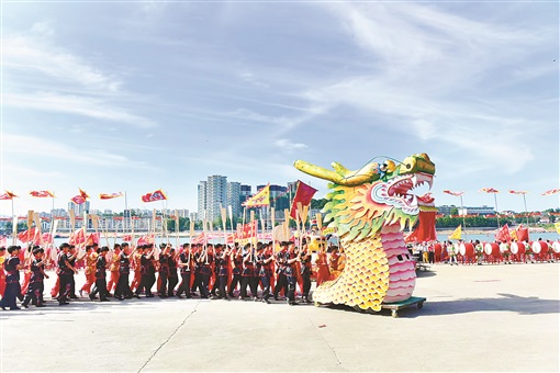 当然,龙船游江时少不得龙头与龙尾,一江碧水,舟行水中,霸气威武的龙头迎面而来,震耳欲聋的鼓声由远及近……一条龙舟的气势很大一部分取决于龙头,龙头做得越雄刚越有气势越好,更被视为镇宅、驱邪、驱魔的作用,于是,工匠们又经过木料开料、放样、雕刻、成型、打磨、上色等工序。待龙头成型后,又为龙头安装上鼻球、龙须、龙舌,讲究的,还将一颗不锈钢珠,涂上黄色,放在龙口中,通通都能活动,显得活灵活现,且龙头又涂上了耀眼的金粉。最后,一个成型的红色或黄色龙头半张大嘴,口中露出龙珠,势若云霄腾飞,龙尾高高翘起,十分威严气派。