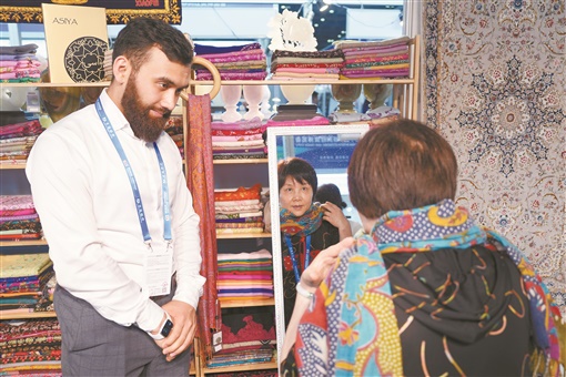 6月30日,长沙国际会展中心,参观者试戴非洲产围巾。