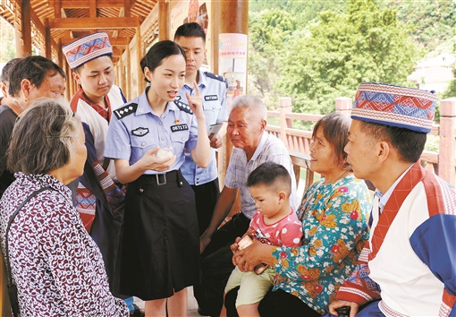 7月12日,洞口县长塘瑶族乡老艾坪村,民警向群众讲解毒品的危害。连日来,该县组织公安民警、禁毒志愿者深入到偏远山区乡村,开展“不让毒品进咱家”禁毒宣传活动,通过发放宣传资料、展示毒品仿真模型等,提高群众识毒、拒毒、防毒能力。 滕治中 摄