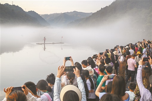 7月14日,游客在资兴市东江湖旅游区欣赏渔夫撒网表演。目前,资兴市东江湖已进入暑期旅游旺季,每天接待游客1万人次以上。近年,该市做好生态环境保护工作,全力推进全域旅游,“雾漫小东江”已成为一张靓丽的旅游名片。