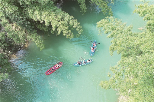 7月16日,龙山县桂塘镇乌龙山大峡谷,游人在河中泛舟。伏夏时节,游人们来到乌龙山大峡谷避暑游玩,在翠竹绿水中乐享清凉。