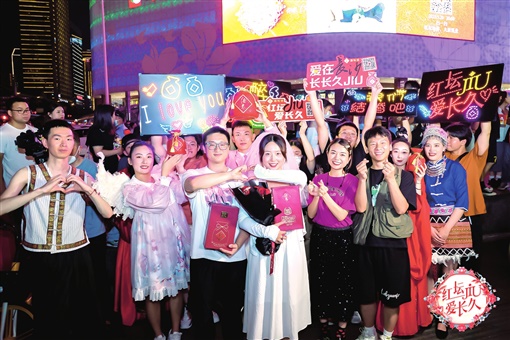 为了鼓励大家大胆告白、大胆说爱,酒鬼酒连续两年在520当天,承包下网红城市长沙市中心超过百块户外大屏,助力大家免费扫码“霸屏”,向爱人、亲人、友人告白,现场吸引了超过10万人打卡参与,大家借助难得的“霸屏”机会,向身边重要的人表达爱意。一名女生受“全城热恋”氛围鼓舞,当场向相恋多年的男友求婚,酒鬼酒邀请《中国婚礼》新人嘉宾张希、胡安媛为一对有情人送上真爱祝福大礼。“红坛酒,爱长久”成为长沙当晚“醉浪漫的事”。