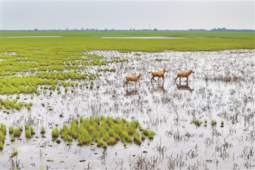 7月26日,南洞庭湖舵杆洲保护区,3头野生麋鹿在滩涂草地漫步。自2018年洞庭湖生态环境专项整治开展以来,南洞庭湖生态系统越来越适宜野生动物栖息。
