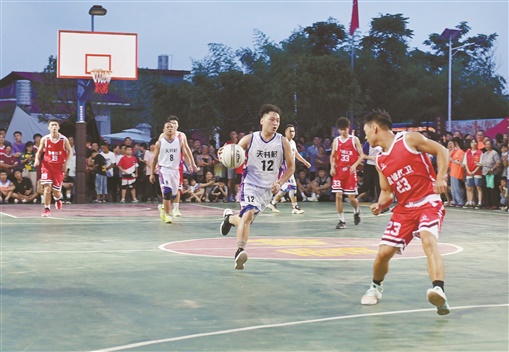 7月25日晚,运动员在洞口县雪峰街道天井村进行篮球比赛。当天,雪峰街道“村BA”(乡村篮球赛)开幕,由当地村民组成的12支篮球队将进行为期10天的角逐,活跃农村群众运动健身氛围。