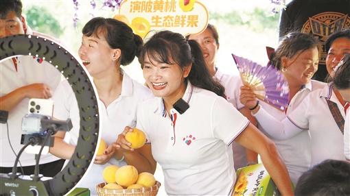 7月29日,网红主播通过抖音平台直播推销黄桃。当天,衡阳县演陂镇五一村举行“相聚演陂,‘桃’醉一夏”第二届黄桃采摘暨乡村文化旅游节。近年来,该县大力发展黄桃产业,已在演陂、三湖、岣嵝等乡镇种植黄桃1.1万余亩,年产值约2.7亿元。王勤 丁源 摄影报道