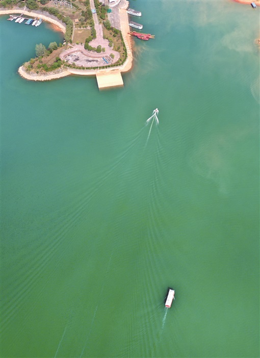 乘船游览,湖风带着清爽扑面而来。“以前水体腥臭,坐船经过非常难受。”水府旅游区事务中心主任熊柱广介绍说,“十三五”期间,两市对水府庙库区环境进行了持续治理,水库内所有养鱼网箱、拦库被取缔,渔民“洗脚上岸”;采砂场永久关闭、沿库工业污染企业关停搬离……绿水青山焕新颜,水库水质从原来Ⅳ类到现在长期稳定在Ⅱ类,先后发现了娃娃鱼、桃花水母等珍稀水生物。库区群众生活环境明显改善,涌现了一批美丽乡村,为水府庙的旅游开发奠定了生态优势。