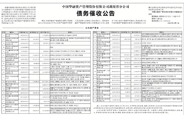 中国华融资产管理股份有限公司湖南省分公司债务催收公告