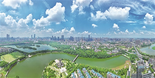 8月3日,长沙市城区在蓝天白云的映衬下,构成一幅绿色生态画卷。近年,长沙坚持生态优先、绿色发展,着力打造天蓝水碧生态之城。今年上半年,长沙城区空气质量优良天数累计151天,空气质量优良率为83.4%,大气、水环境质量持续向好。