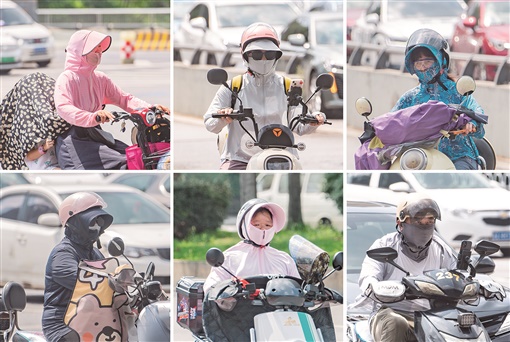 8月4日,长沙街头,市民“全副武装”出行。当天市区最高气温升至37℃以上,长沙市气象台发布高温橙色预警信号,提醒市民加强防范。