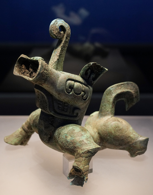 图为5月18日拍摄的三星堆遗址3号“祭祀坑”出土的一件形似“机器狗”的铜神兽。