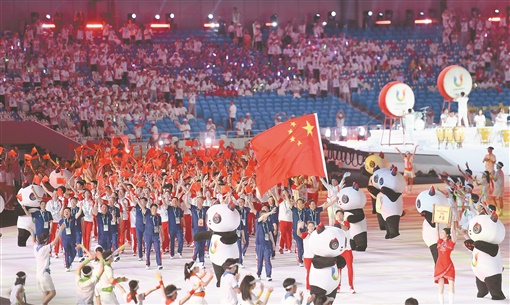 7月28日晚,第31届世界大学生夏季运动会开幕式在成都东安湖体育公园主体育场举行。图为中国大学生体育代表团入场。 |