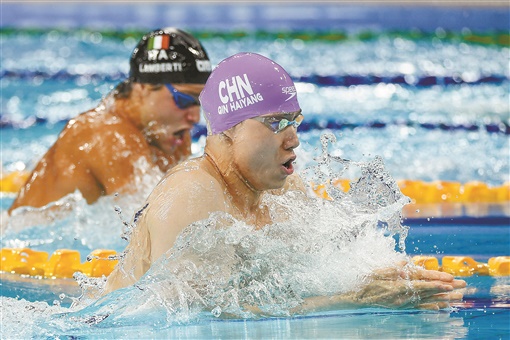 8月4日,男子200米蛙泳决赛中,中国选手覃海洋(右)夺得冠军。 |