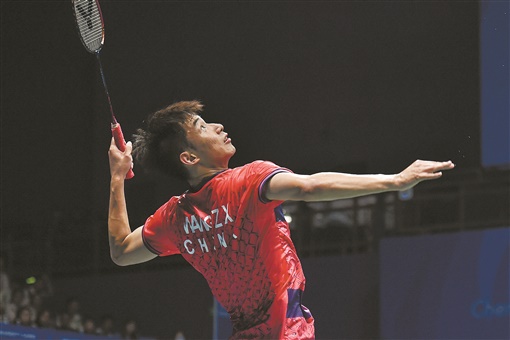 来自怀化的中国选手王正行获得本届大运会羽毛球男子单打冠军。图为王正行在比赛中。 |