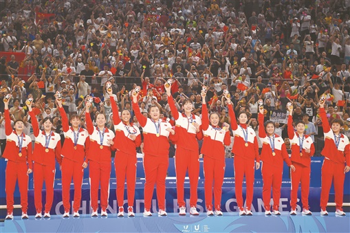 8月5日晚,中国大学生女篮99-91战胜日本队,夺得冠军。图为中国队球员在颁奖仪式上。 |