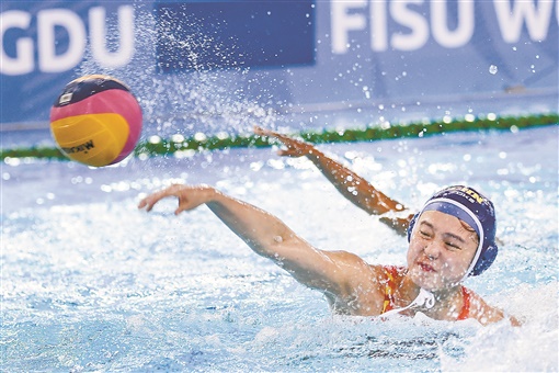 8月3日,在水球项目女子小组赛中,来自岳阳的运动员熊敦瀚在比赛中进攻。她所在的中国女子水球队夺得金牌。 |
