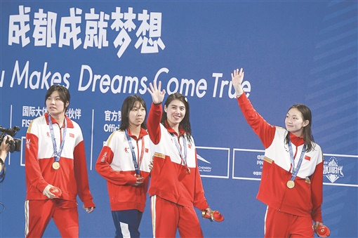 8月4日,在女子4x200米自由泳接力决赛中,由柳雅欣、井上北华、张雨霏、李冰洁组成的中国队以7分58秒77的成绩获得冠军。图为中国队选手夺冠后向观众挥手致意。 |