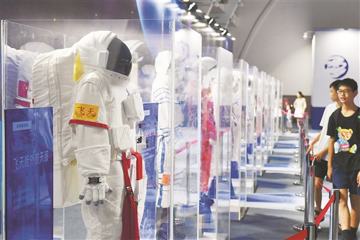 8月7日,市民在省展览馆“太空漫步航天科技艺术展”参观体验。该展览展示了全球航天服、古今观天仪器、追摄天宫空间站摄影作品等百余个项目,通过虚拟现实、多媒体交互等多种形式,带给观众沉浸式的航天体验。