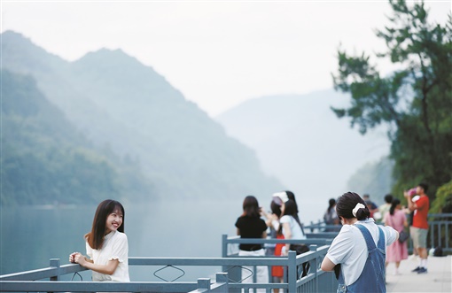 8月9日,游客在资兴市东江湖景区游玩赏景。暑期,该景区推出一系列旅游优惠政策,吸引全国各地游客前来游览山水,放松身心。近年来,资兴市坚持走生态惠民绿色发展之路,狠抓生态环境保护工作,以“水”生态文明为鲜明特色的全域旅游得到大力发展。 李科 摄
