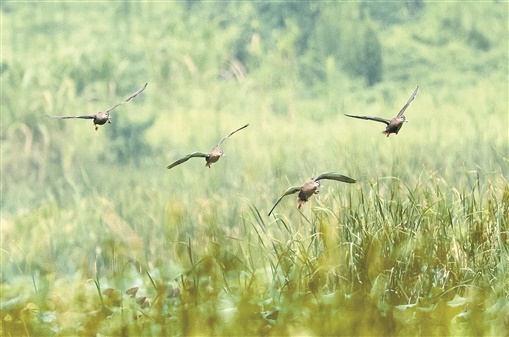 8月11日,4只斑嘴鸭准备“降落”在长沙县松雅湖。每年3月起,斑嘴鸭从南往北迁,但也有少数喜欢湖南的生态环境,成为留鸟。