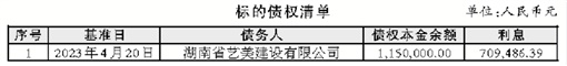本次拟处置的资产为南省艺美建设有限公司单户债权资产(以下简称“标的债权”)。截至2023年4月20日(处置基准日),标的债权总额合计1,859,486.39元,其中:本金余额合计人民币1,150,000.00元,利息余额合计人民币709,486.39元。