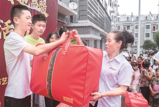 8月20日,涟源市伏口镇,湖南省湘丝梦布艺有限公司为考上涟源市一中的100名优秀学生捐赠爱心物资。