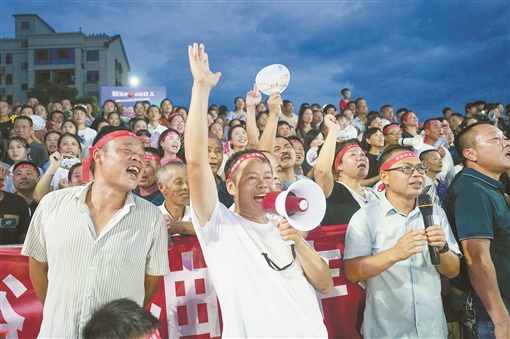 7月20日,浏阳市永安镇,丰裕村代表队的球迷手拿喇叭、话筒,为自己村的球队加油助威。 |